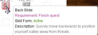 Talk to him and choose the menu option for **'Back Slide'.** He will ask you to bring him some items in exchange for learning the skill. When you have the items, talk to him and choose the same option again.